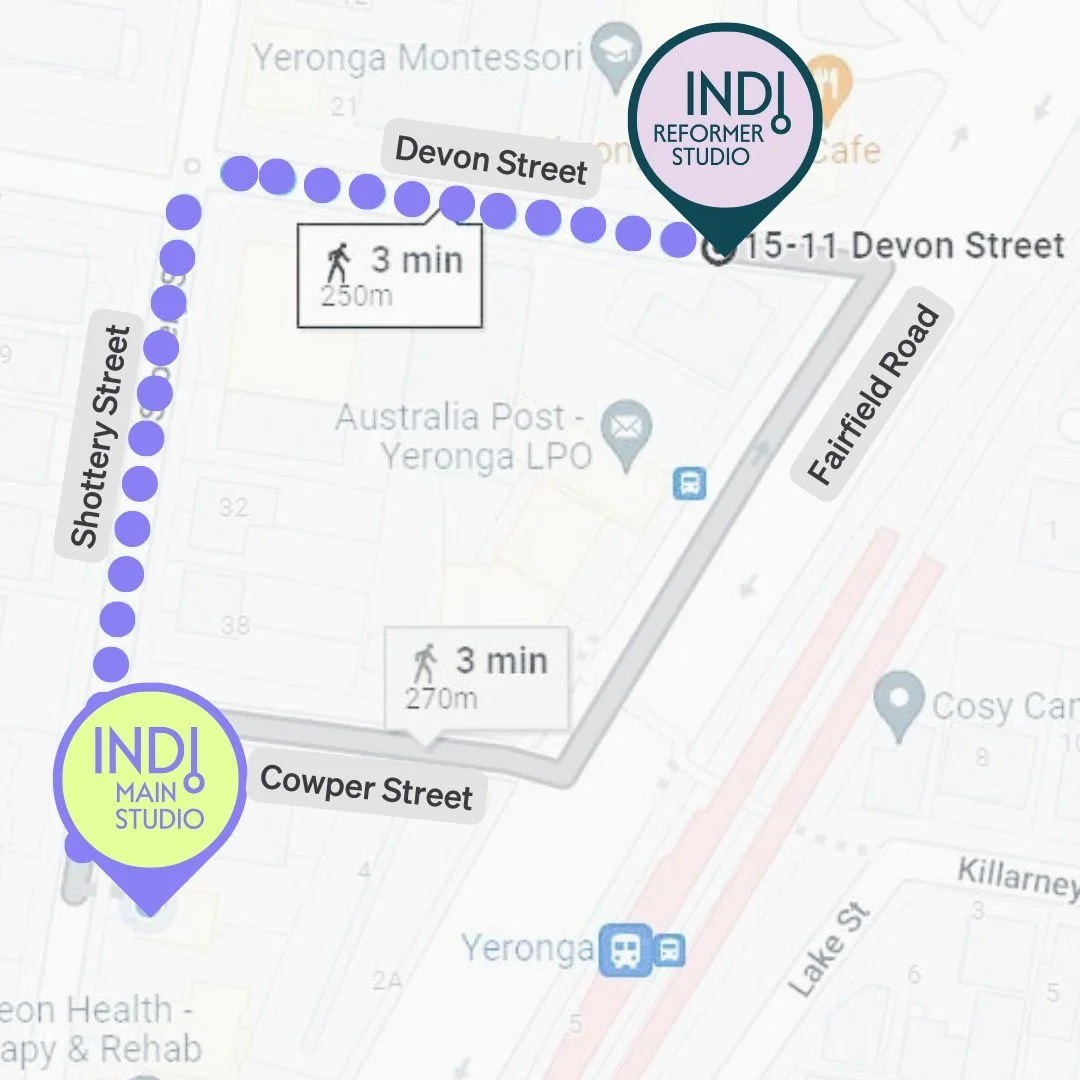 Our Reformer Pilates studio is a quick, 200m walk around the corner from our Yoga, Mat & Barre Studio underneath the Yeronga Village Bakery. You can use the Yeronga Village Complex car park. There is also street parking on Devon St and surrounds. Reformer equipment & props, air-con, water and toilets are all available onsite.