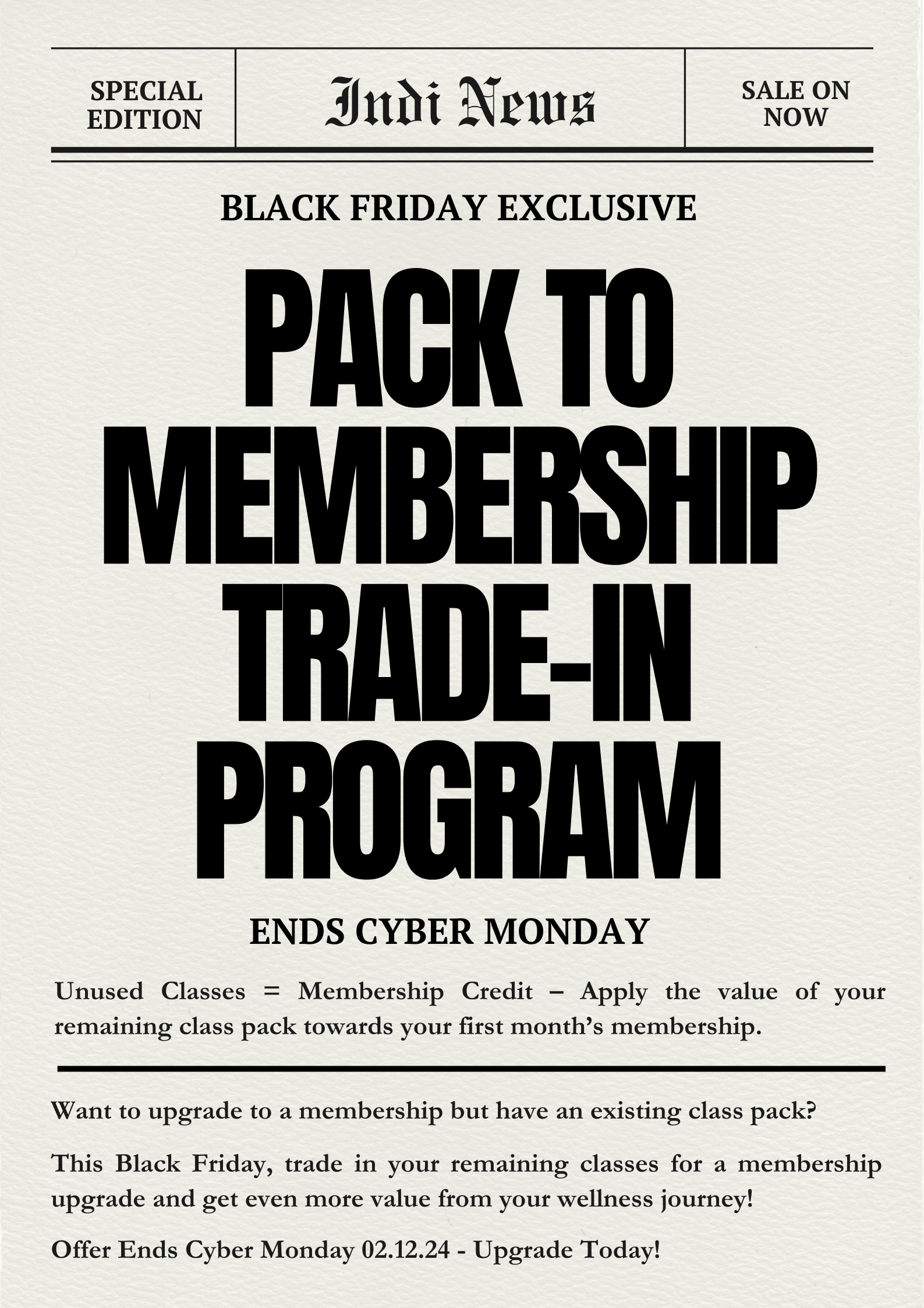 This Black Friday, trade in your remaining classes for a membership upgrade and get even more value from your wellness journey! To get this offer, please email info@indigosoulwellness.com with the subject line CLASS PACK TRADE IN! Don’t forget to include what membership you would like to join by trading your Class Pack.